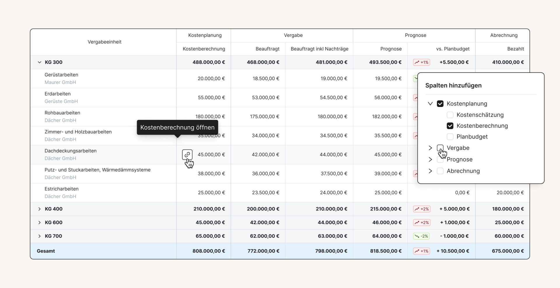 Von der ersten Kostenschätzung über die Ausschreibung bis zur geprüften Schlussrechnung in einem übersichtlichen System.