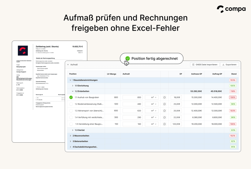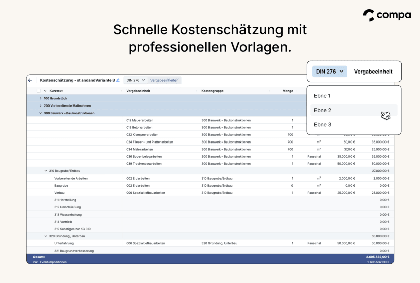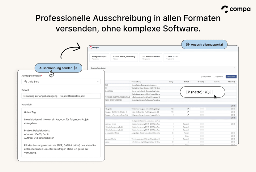 Compa ist eine cloudbasierte AVA-Software, die ohne Installation auf allen Betriebssystemen (u. a. Windows und Mac) läuft. Fokussiert auf die wesentlichen Funktionen – darunter Kostenrahmen, Kostenschätzung, Kostenberechnung, Kostenfeststellung, Leistungsverzeichnisse, Ausschreibung, Vergabe, Aufmaß- und Rechnungsprüfung sowie Nachtragsmanagement – ermöglicht sie eine strukturierte Projektplanung und -umsetzung über alle Leistungsphasen hinweg. "Ich gebe die Kosten ein und wenn ich Monate später drauf gucke, dann sind die immer noch nachvollziehbar." Besonderes Augenmerk liegt auf der intuitiven Nutzung und der übersichtlichen Oberfläche. Damit richtet sich Compa an Büros, die eine schlanke und zuverlässige Lösung bevorzugen: Projekte lassen sich in kurzer Zeit und ohne Schulungsaufwand anlegen, mit Drag-and-Drop-Inhalten aus professionellen Vorlagen inklusive Preisdatenbank füllen und in den gängigen Formaten GAEB, Excel und PDF herunterladen. Vorhandene GAEB-Dateien wie z. B. Leistungsverzeichnisse können zudem importiert werden. "Endlich eine Software, die keine Einarbeitung braucht. Ich bin Architekt – kein IT-Experte.“ Mehr als 1.000 Architekt/IngenieurInnen in Deutschland nutzen die Software regelmäßig. Auf Trustpilot erreicht Compa eine Bewertung von 4,7/5 Punkten. Der Vertrag ist flexibel künd- oder pausierbar und der Support per Telefon, Chat oder E-Mail im Preis enthalten.